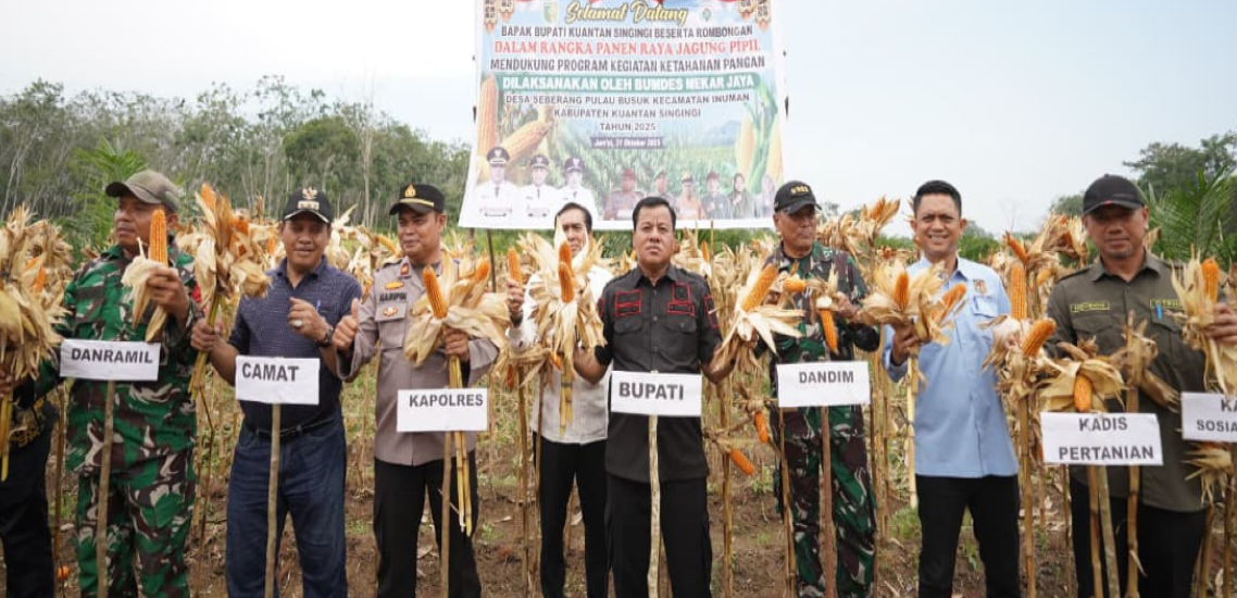 Kampung Tengah – Upaya Pemerintah Kabupaten Kuantan Singingi (Kuansing) dalam memperkuat ketahanan pangan terus mendapat dukungan nyata di tengah masyarakat. Hal ini terlihat pada kegiatan panen raya jagung pipil di Desa Kampung Tengah, Kecamatan Kuantan Hilir, Rabu (24/9/2025) pagi.